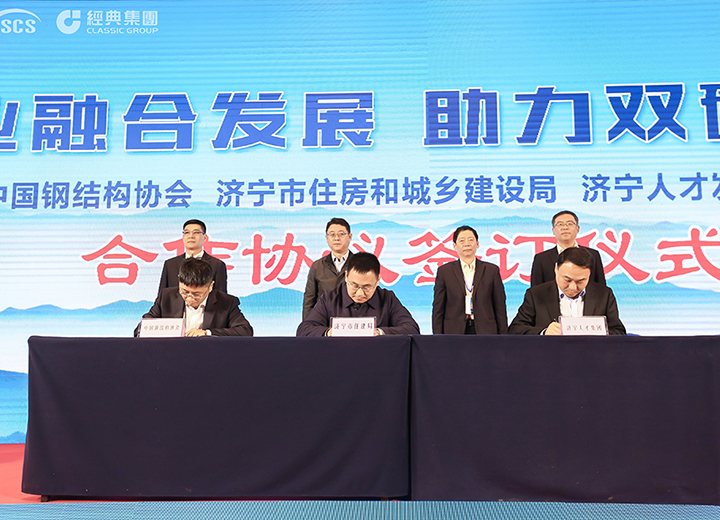 中國(guó)鋼結(jié)構(gòu)協(xié)會(huì)、濟(jì)寧市住房和城鄉(xiāng)建設(shè)局、濟(jì)寧人才發(fā)展集團(tuán)三方人才合作簽約儀式。