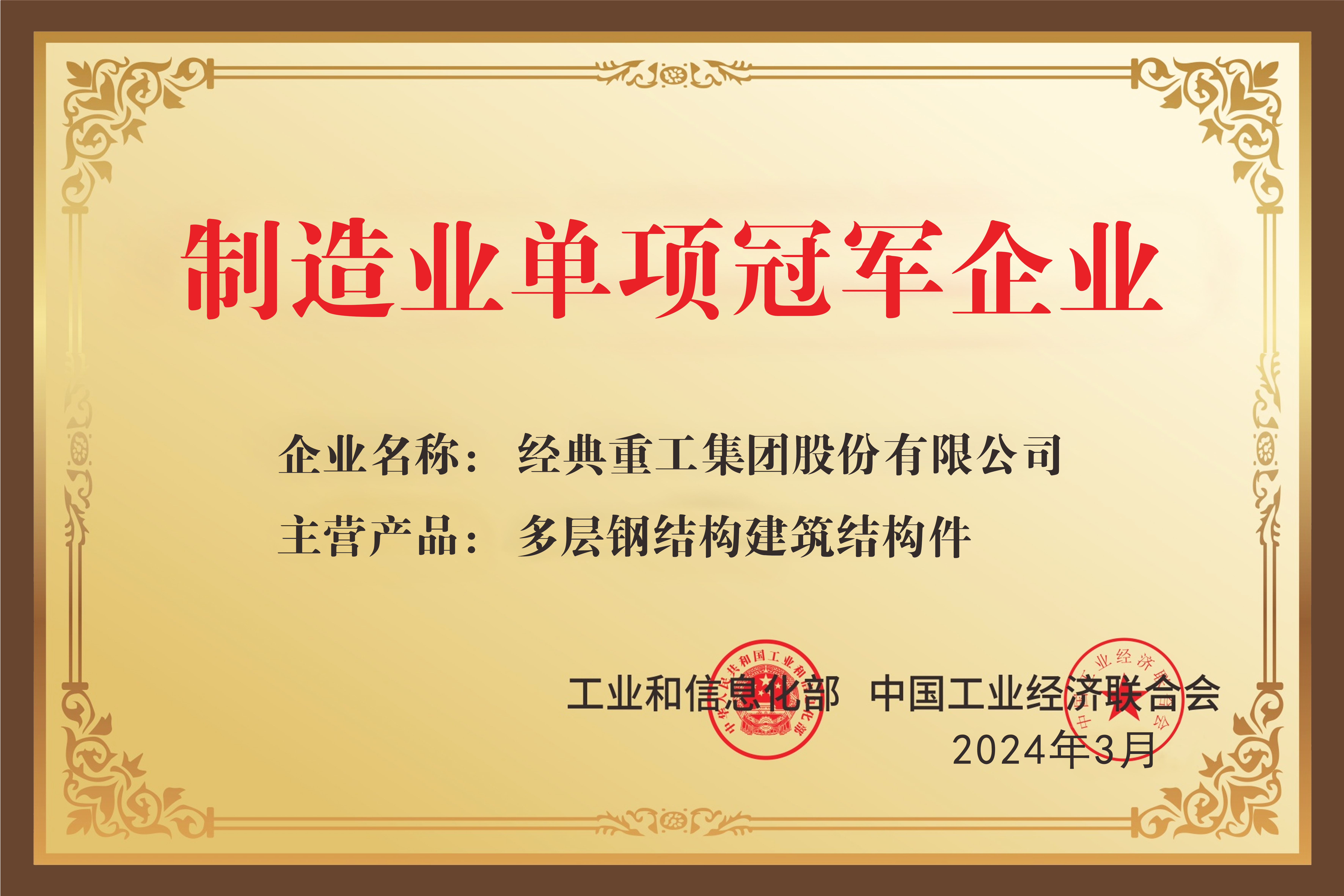 經(jīng)典集團(tuán)榮獲“國(guó)家級(jí)制造業(yè)單項(xiàng)冠軍示范企業(yè)”稱號(hào)。