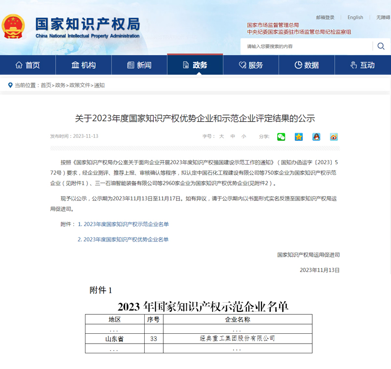 近日,國(guó)家知識(shí)產(chǎn)權(quán)局對(duì)2023年度國(guó)家知識(shí)產(chǎn)權(quán)示范企業(yè)和優(yōu)勢(shì)企業(yè)評(píng)定結(jié)果的公示。其中,經(jīng)典集團(tuán)被認(rèn)定為“2023年國(guó)家知識(shí)產(chǎn)權(quán)示范企業(yè)”。
