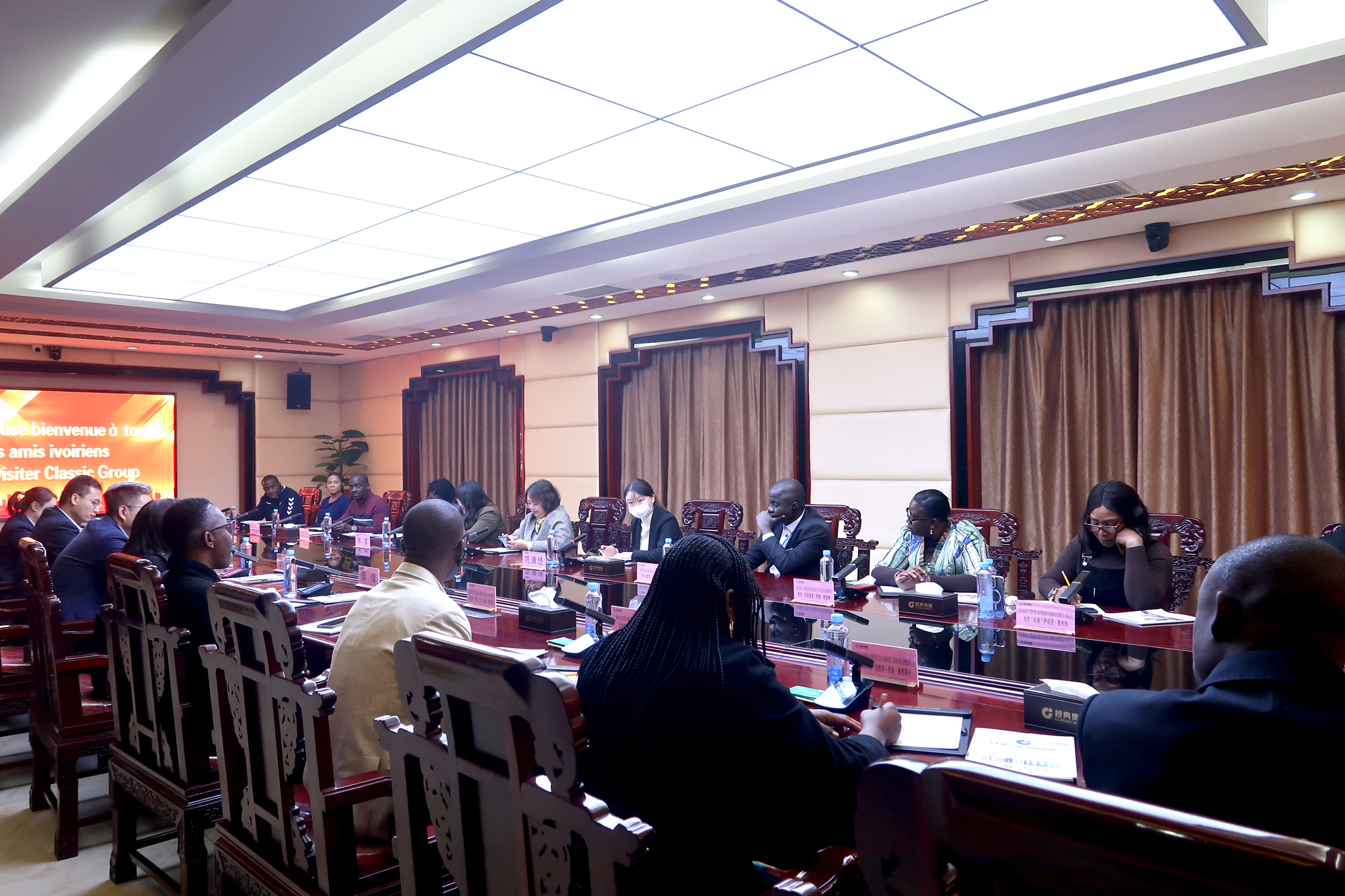 研修班學(xué)員先后參觀了經(jīng)典集團(tuán)凱思諾智能化生產(chǎn)線、中冶智能化生產(chǎn)車間以及高端裝配式建筑集成房屋項(xiàng)目,親眼見證了智能制造的魅力與高效。隨后的座談會(huì)上,張琦對(duì)遠(yuǎn)道而來的研修班學(xué)員表示誠(chéng)摯歡迎,分享了集團(tuán)發(fā)展歷程、生產(chǎn)經(jīng)營(yíng)、企業(yè)文化建設(shè)等情況,著重闡述了集團(tuán)產(chǎn)業(yè)布局和對(duì)外貿(mào)易情況。研修班成員對(duì)經(jīng)典集團(tuán)裝配式建筑集群規(guī)模及對(duì)外貿(mào)易合作的廣泛影響力給予了高度評(píng)價(jià),對(duì)集團(tuán)的智能制造技術(shù)和卓越產(chǎn)品品質(zhì)表達(dá)了由衷的贊賞與認(rèn)同,并表達(dá)了未來深化交流、共促科特迪瓦建筑鋼結(jié)構(gòu)行業(yè)發(fā)展的美好愿景,共謀互利共贏的未來。