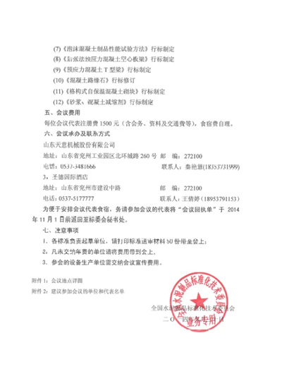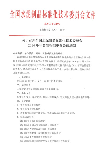 11月7日-9日全國水泥制品標準化技術(shù)委員會2014年年會暨標準審查會在山東天意機械股份有限公司隆重召開。屆時,委員會相關(guān)領(lǐng)導(dǎo)及行業(yè)相關(guān)科研人員將蒞臨會議,共同商討制訂行業(yè)有關(guān)標準。誠邀各界人士屆時蒞臨天意機械、經(jīng)典集團、卓越精工參觀指導(dǎo)。