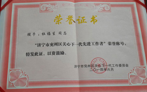 會上,經(jīng)典集團總經(jīng)理杜福生被授予“濟寧市兗州區(qū)關(guān)心下一代先進工作者”,并高度贊揚了先進工作者情系下一代、無私奉獻的精神。