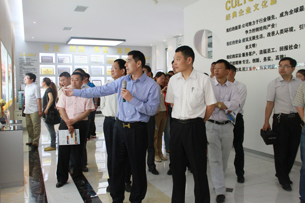 考察團(tuán)一行參觀了經(jīng)典集團(tuán)的文化館、項目中心、綜合辦公室、營銷中心和生產(chǎn)車間。苗樹文董事長向考察團(tuán)介紹了經(jīng)典集團(tuán)的生產(chǎn)經(jīng)營、項目建設(shè)、產(chǎn)學(xué)研合作、技術(shù)創(chuàng)新等情況。隨后,考察團(tuán)一行實地參觀了經(jīng)典集團(tuán)職工培訓(xùn)室、閱覽室、乒乓球室、臺球室、愛心超市和宴會廳,進(jìn)一步了解了企業(yè)的文化建設(shè)有關(guān)情況。