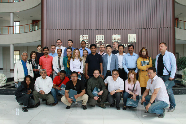 亞歐二十六國政府官員及行業(yè)協(xié)會領(lǐng)導(dǎo),不顧勞途奔波,下車后就興致勃勃的參觀了經(jīng)典集團辦公樓,為其古典與現(xiàn)代結(jié)合的優(yōu)美辦公環(huán)境所嘆服,隨后苗董帶領(lǐng)客人一行,參觀了職工活動中心,生產(chǎn)車間,客人詳細了解了車間生產(chǎn)狀況及員工的福利待遇情況,最后在會議中心,集團國際事業(yè)部負責人與考察團一行進行了座談,客人一行詳細了解了公司的概況以及海外市場業(yè)務(wù)進展狀況,集團國際事業(yè)部負責人一一解答,座談后與斯里蘭卡貿(mào)易和投資促進會秘書長哈尼爾先生(Nihal Aluvihare)及尼泊爾、匈牙利、保加利亞等國簽署了對外貿(mào)易合作協(xié)議。