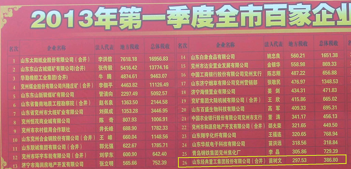 為表彰和宣傳企業(yè)誠信納稅,進(jìn)一步扶持企業(yè)做大做強(qiáng),同時推動兗州經(jīng)濟(jì)升級發(fā)展,近期兗州市對2013年第一季度納稅50強(qiáng)企業(yè)排行榜進(jìn)行了公示,山東經(jīng)典重工集團(tuán)股份有限公司榮登2013年第一季度兗州納稅五十強(qiáng)企業(yè)排行榜第二十六位。