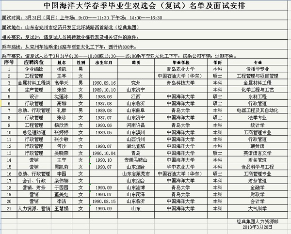 3月28日,繼青島理工大學(xué)2013年春季畢業(yè)生雙選會(huì)結(jié)束后,經(jīng)典集團(tuán)又一次組織參加中國(guó)海洋大學(xué)畢業(yè)生雙選會(huì)。我公司董事長(zhǎng)苗樹文,總經(jīng)理杜福生等領(lǐng)導(dǎo)一同參加了此次雙選會(huì)。